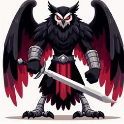 He is depicted as a humanoid with an angel's wings and an owl's head, riding a strong black wolf and holding a gleaming bright sharp sword.