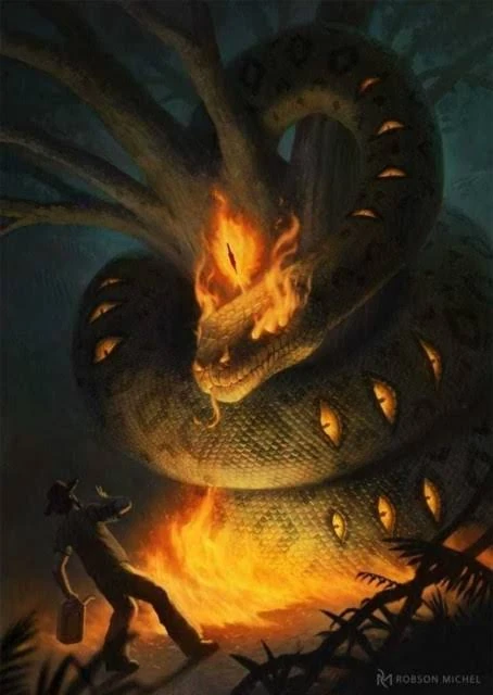 The Boitatá is a legendary monster from Tupi-Guarani mythology. It takes the form of a huge fire serpent that appears and attacks those who harm the forests and animals of the Amazon.