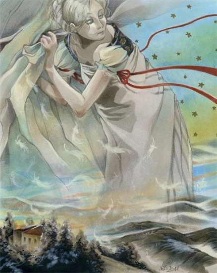 She is associated with many of the evergreen plants that appear during the Yule season, especially mistletoe and holly, and is sometimes seen as an aspect of Frigga, wife of Odin. In this theme, she is associated with fertility and rebirth. Her feast day is December 25, and typically, she is seen as a goddess of hearth and home, although in different areas she has clearly different purposes. It is said that when Frau Holle shakes out her mattresses, white feathers fall to the earth. A feast is held in her honor each winter by many people in the Germanic countries.