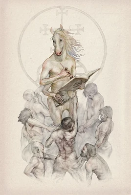 Gamigin is depicted as a little horse or a donkey, which changes form into a man under the conjurer's request. Other times he takes the form of an anthropomorphic horse with four sets of arms. He is the fourth spirit of the Goetia.