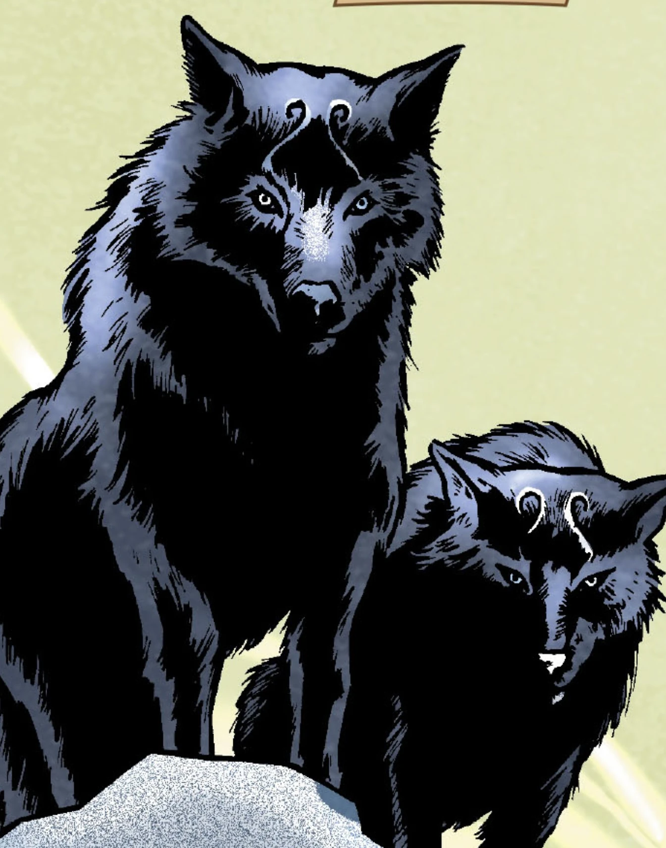 Geri and Freki are two primordial wolves, or wargs according to some sources, that act as Odin's travel companions.