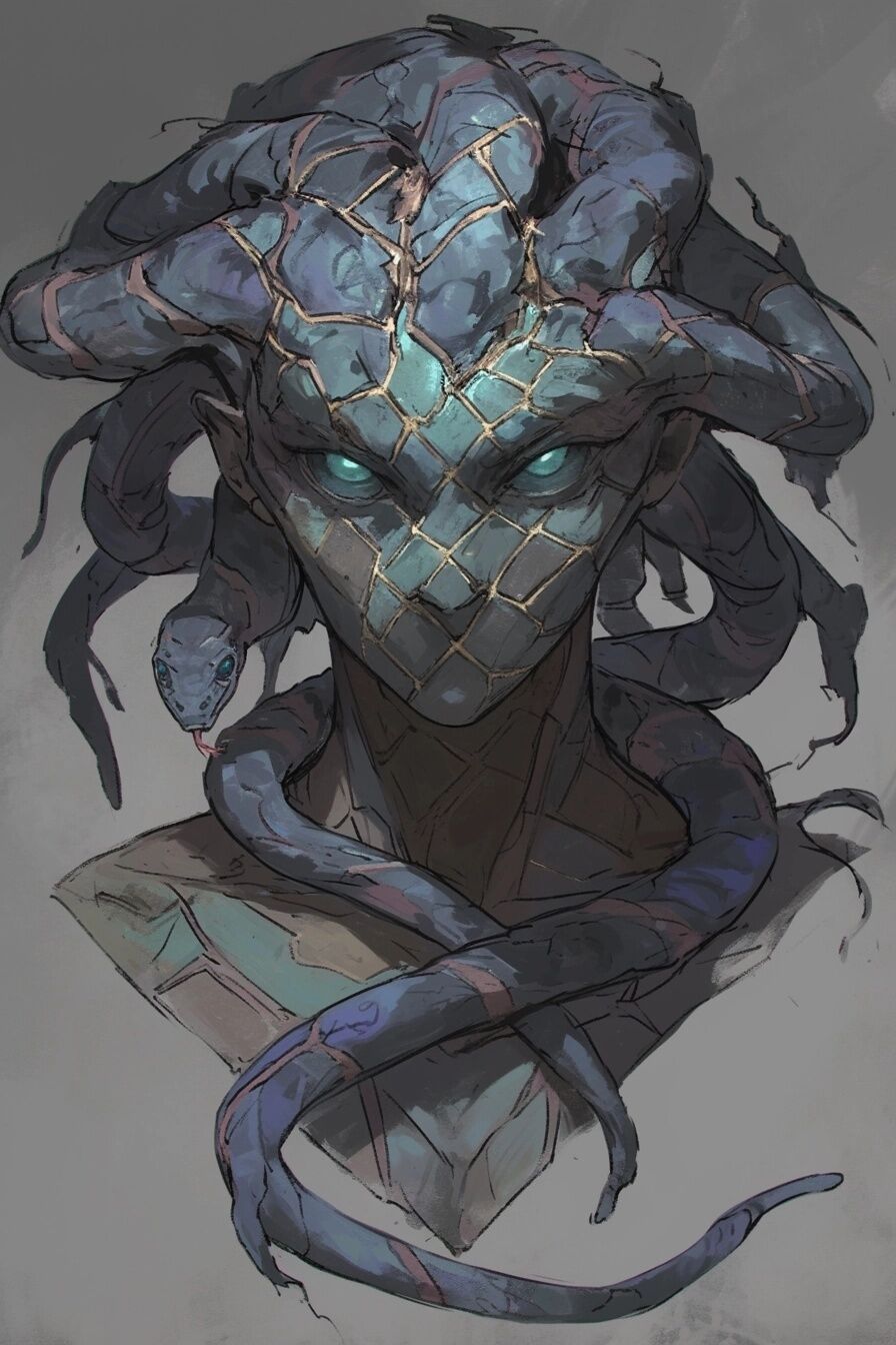 Stheno tends to be depicted as a thin gorgon monster with red snakes curling around her head instead of hair. Earlier accounts, however, describe her as having a scaly head, a boar's tusks, bronzed hands, a protruding tongue, glaring eyes and a snake around the waist as a belt.