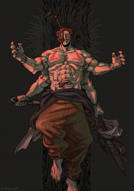 He would trample through entire armies and demolish entire cities and kingdoms just so he could bathe in the blood of humans and cement his power over them. He never cares for the consequences of his actions even when said actions garner the attention of individuals that are purportedly stronger than him like Satan. While taking most things in casually cruel stride, he does have a temper. When angered, Theokoles has shown a much more stoic and cold side to himself, putting aside his usual evil smiles and having a scowl on his face while making his fury clear with swift retaliations. But when truly pushed, his anger implodes into violent fury and becomes utterly relentless in his brutality.