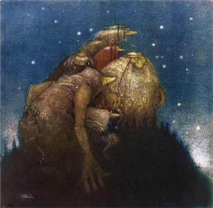 Trolls are hideous giants that were said to have descended from Jötunar. They live in mountains, murky swamps, around large boulders and inside caves. They a normally solitary creatures but sometimes live in small family groups. They are known for rarely helping others and are often depicted as man-eaters, tricksters and violent. Born with horrific appetites, trolls eat anything they can catch and devour. Because of their innate violence, medieval Norwegian law recognized the threat that Trolls pose and thus during the 12th and 14th centuries laws made it illegal to sit outside to awaken Trolls in order to perform heathenism.